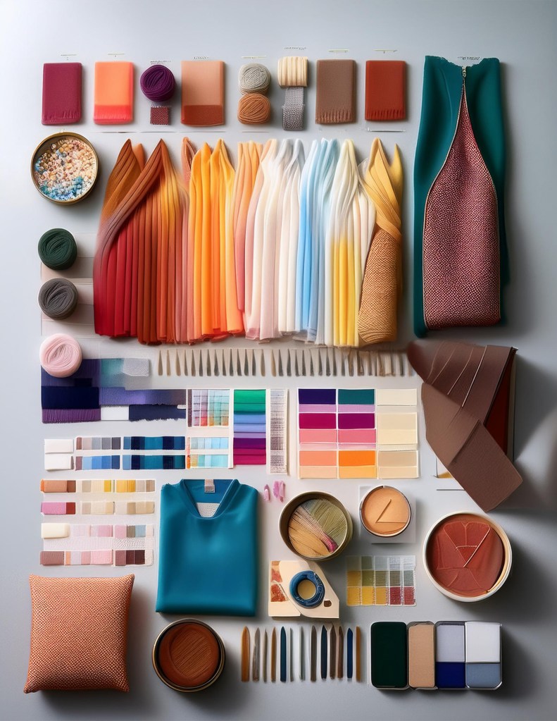 My third use of AI within the project was used to generate the sample images of clothing and product inspiration. I began with the prompt “create a brand kit graphic for a behind the scenes look into a clothing company and include colors, fonts, and design elements.” With this, I was expecting a very straightforward graphic, similar to what I created, that clearly laid out each of the elements in the prompt. Instead, the AI generator created a realistic style image that included fabric, yarn, pieces of clothing, fabric swatches, and zippers. From this, I decided to use the eraser tool and quick selection tool to cut out the specific elements I wanted to include in my design. Then, I used the spot healing brush to clean up the random brush strokes that were generated, and overall make the elements look realistic. Ultimately, I went back to AI and used it to generate several other images of different clothing samples to use as inspiration/mock up pieces.